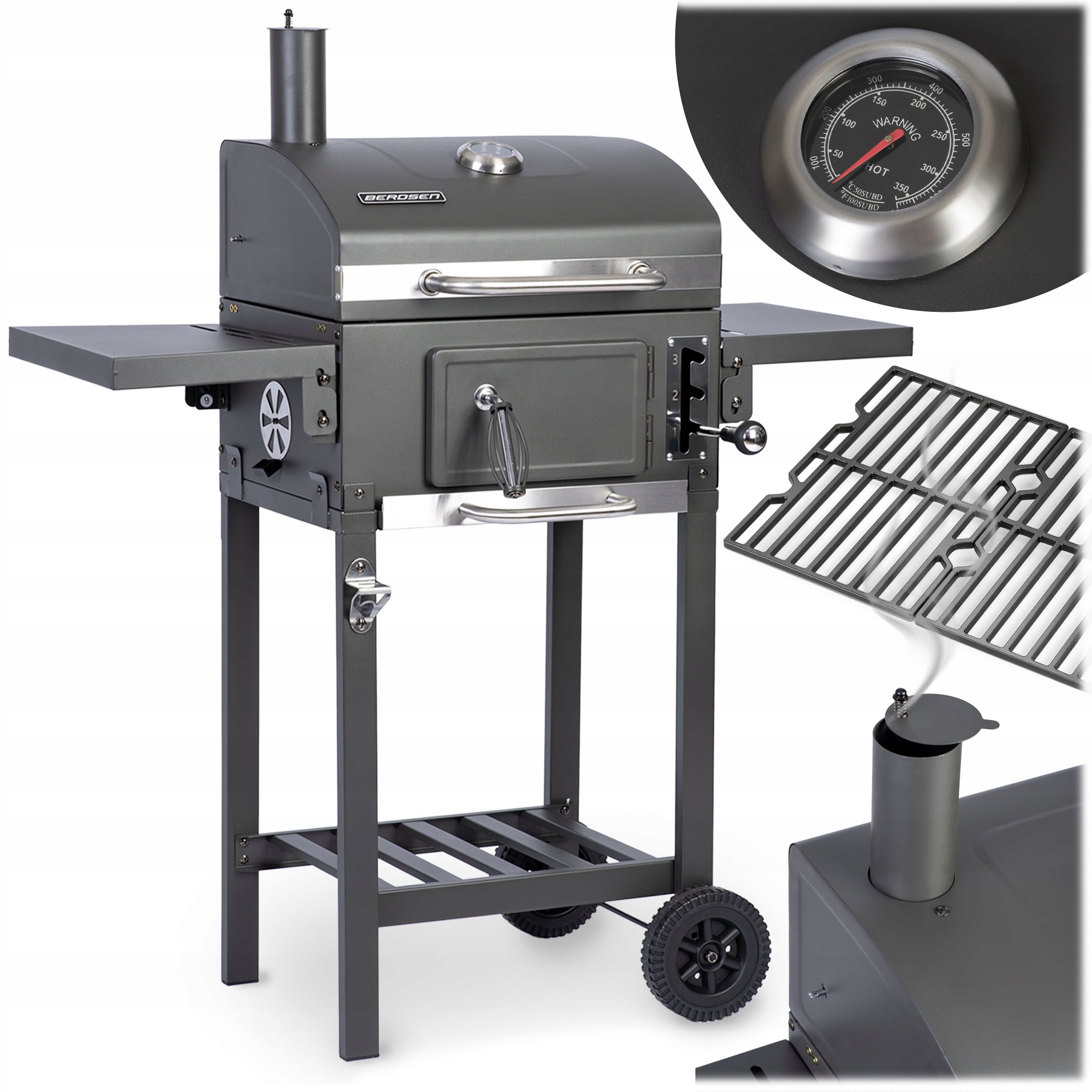 GRILL WĘGLOWY OGRODOWY KOMIN ŻELIWNY RUSZT Z POKRYWĄ POPIELNIK + TERMOMETR Producent Berdsen
